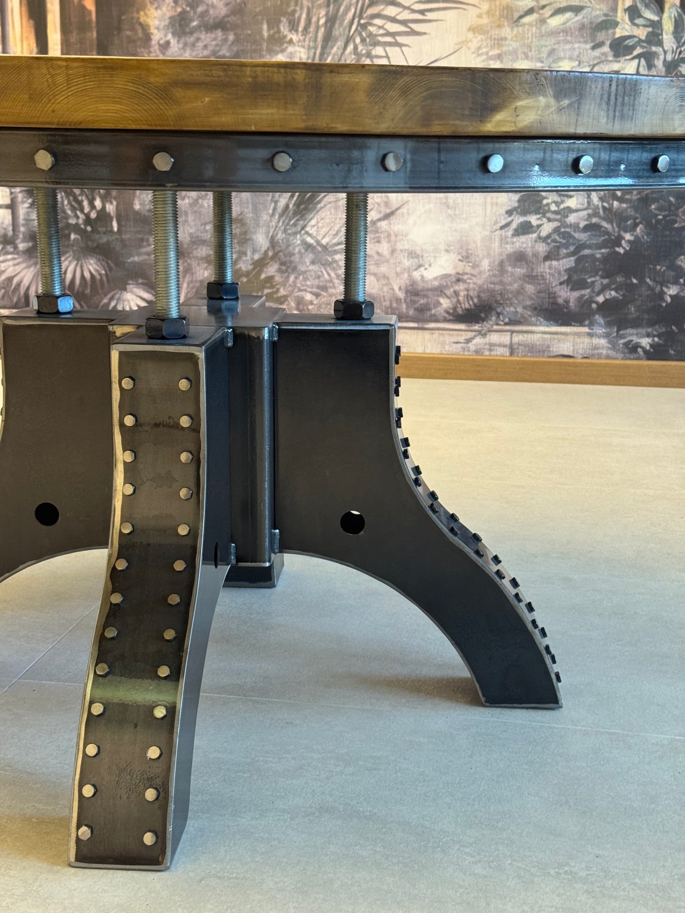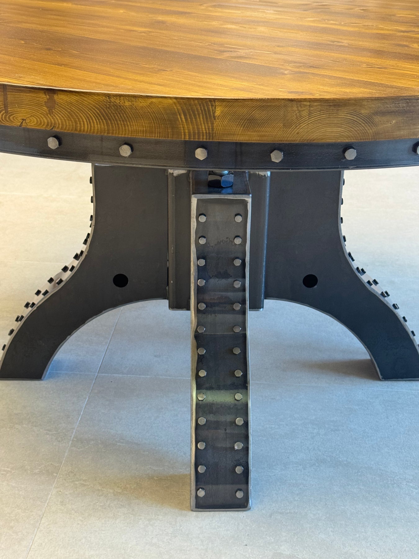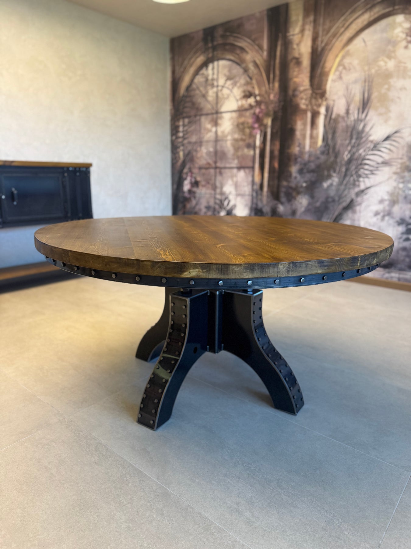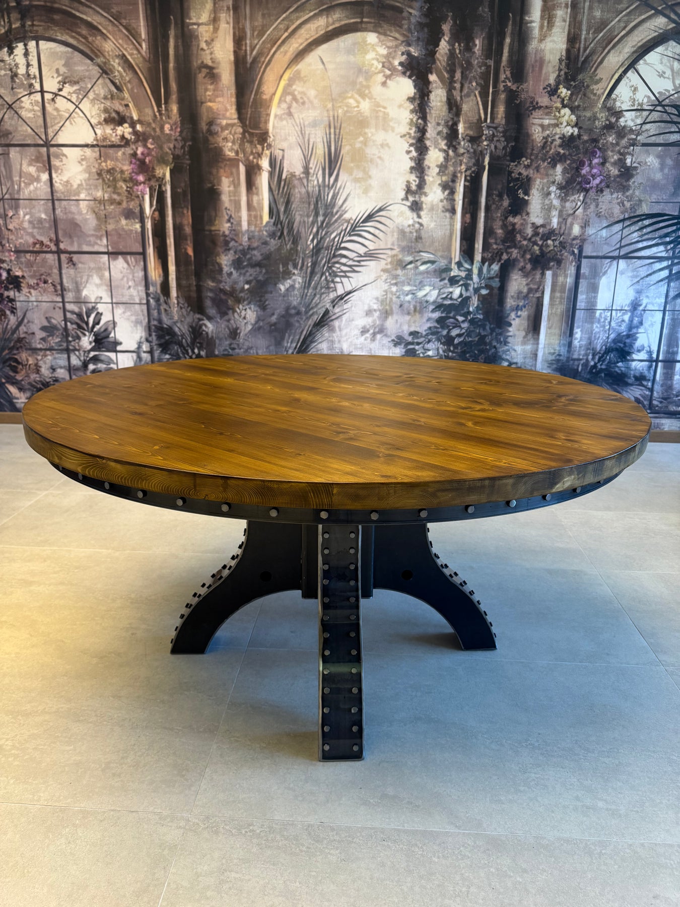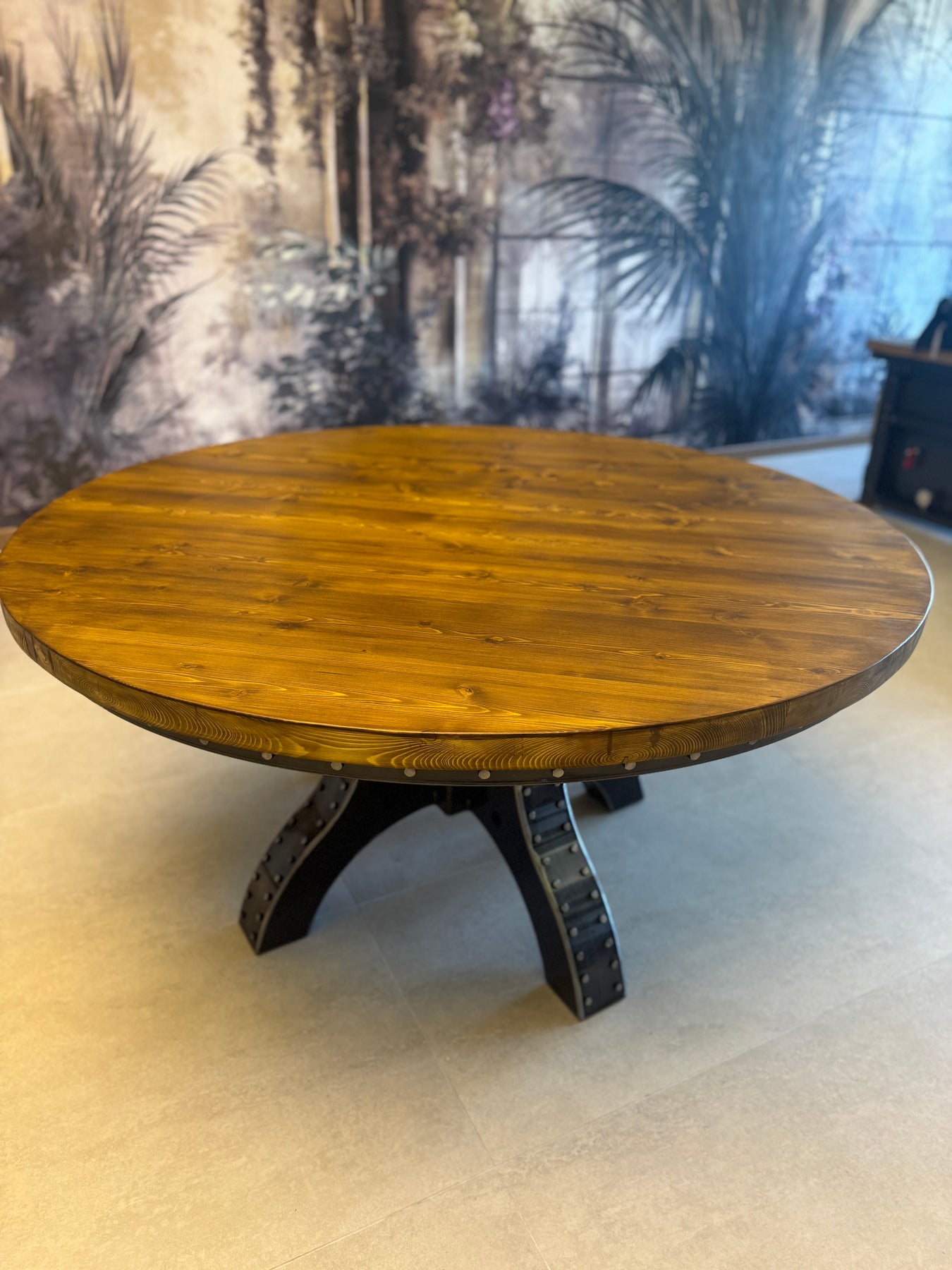 Retro Aspendos Table reflects the industrial art style with its metal custom-made legs and round designed wooden table top. Its completely transparent acrylic painted surface offers durability and aesthetics together. It is an ideal choice for those looking for both modern and vintage touches.