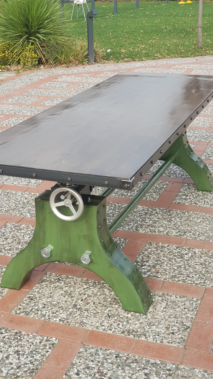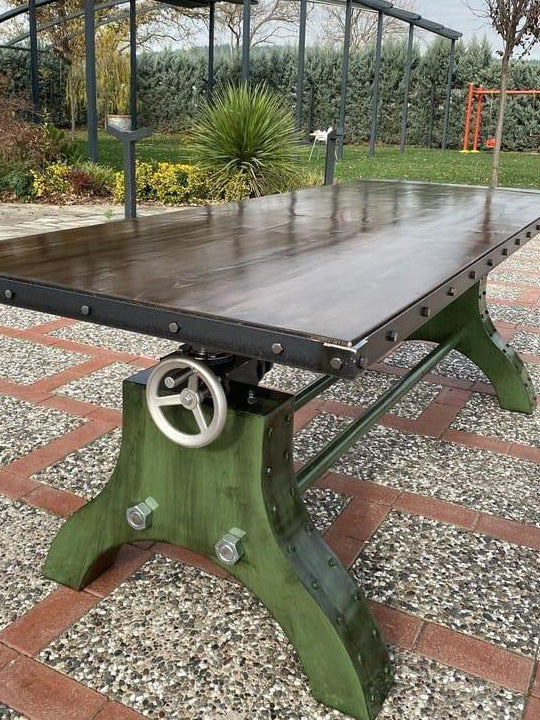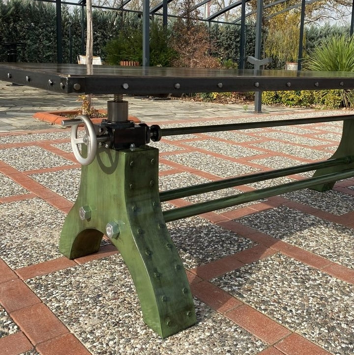 Green Retro Crank Table has a stylish design in a distressed green color. Its metal base is equipped with a lever that allows you to easily adjust the height of the table. This mechanism allows you to quickly and practically organize your workspace according to your needs. This table, both aesthetic and functional, is an ideal choice for those who love the retro style.